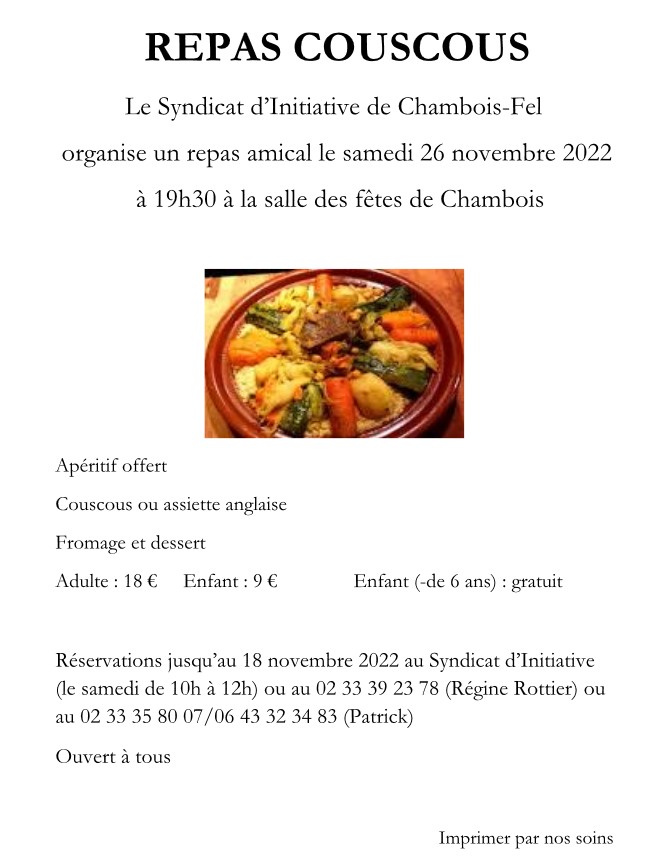Infomations et réservations avant le 10 novembre au Syndicat d'Initiative.